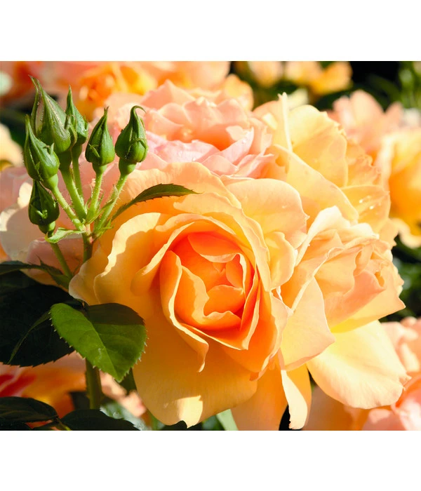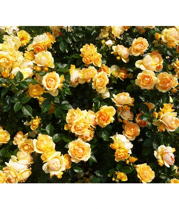 Vorhang auf, Bühne frei für die Primadonna unter den Rosen: die Beetrose ‚Hansestadt Rostock®‘ taucht Ihren Garten von Mai bis Juli in ein bernstein- bis apricotfarbenes Blütenmeer und blüht bis in den September nach. Ein Anblick, der einfach atemberaubend ist! Da ist es nicht verwunderlich, dass diese außergewöhnliche Rosenzüchtung seit ihrer Taufe im Jahr 2010 reihenweise Preise gewonnen hat, unter anderem die Goldmedaillen von Baden-Baden, von Paris und von Monza. Die leicht duftende Beetrose ‚Hansestadt Rostock®‘ sprüht förmlich vor Vitalität und begeistert neben den dicht gefüllten, lange haltbaren Blüten auch mit ihrem kompakt buschigen Wuchs und dem frischgrün glänzenden Laub. Außerdem verfügt diese Rosensorte über eine hervorragende Widerstandfähigkeit gegenüber den üblichen Rosenkrankheiten, so dass sie sogar mit dem ADR-Qualitätssiegel ausgezeichnet wurde. Die Beetrose ‚Hansestadt Rostock®‘ eignet sich für alle Pflanzbereiche im Garten, wirkt solo wie in Gruppen als bezaubernder Blickfang.