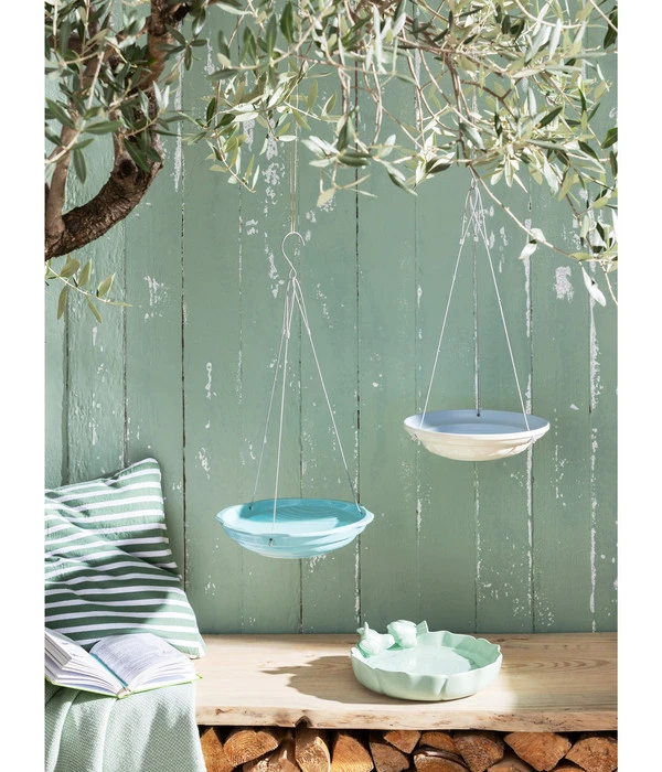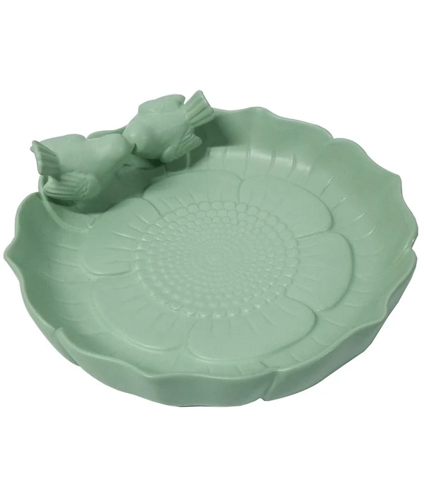 Was für ein schönes Planschbecken! Diese dekorative Wasserstelle für Wildvögel ist aus hochwertigem, wetterfestem Steinzeug in der Form einer runden Blüte gefertigt. Auch der Boden der Vogeltränke wurde mit einem feinen Blütenrelief verziert. Das zarte Grün passt perfekt in jedes Gartenambiente. Und die nach oben gebogene Blütenform sieht nicht nur höchst ansprechend aus, sondern bietet den Piepmätzen auch einen idealen Landerand aus dem Flug zum bequemen Trinken oder Baden. Zwei Vögel als zusätzliche Dekoration machen diese schöne Vogeltränke zum Blickfang und lassen keinen Zweifel daran, wer hier zum Baden herzlich eingeladen ist!