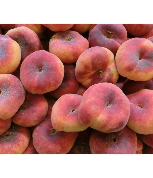 Eine ganz besondere Sorte stellt der Tellerpfirsich dar. Er wird wegen seiner flachen Form auch Plattpfirsich genannt. Oftmals wird davon ausgegangen, dass es sich hierbei um eine Neuzüchtung handelt, jedoch wird der Tellerpfirsich schon seit 2500 Jahren in China kultiviert. Die Pflanze zählt zu den robusten Sorten und ist sehr gut winterhart, ausgewachsen bis circa -25°C. Es handelt sich um einen sehr schnell wachsenden Baum, der stark verzweigt ist und bis zu fünf Metern hoch werden kann. Die Pflanze überzeugt durch drei Eigenschaften: Blüten, Früchte und Blätter. Die Blüten kann man ab Anfang April bewundern. Sie erscheinen noch vor dem Austrieb der Blätter. Sie sind zart rosa, glockenförmig und verbreiten einen angenehmen Duft. Die Früchte begeistern durch ihre besondere Form, die nur bei Vollreife geerntet werden sollen. Die Früchte schmecken süß, aromatisch und saftig. Die Schale ist gelb-rot und dünner als bei anderen Sorten. Auch die Früchte duften hervorragend und können ab September geerntet werden. Die Blätter färben sich im Herbst feuerrot und passen somit super in jeden Herbstgarten.