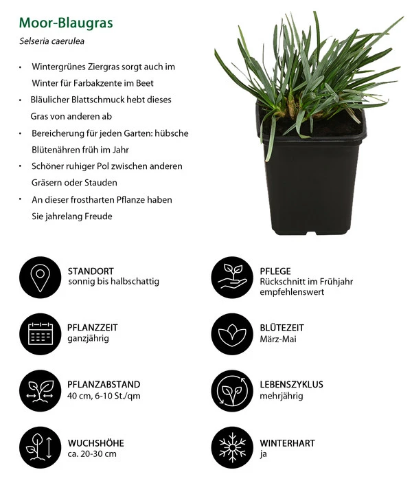 Dieses Ziergras trägt seinen Namen völlig zu Recht, denn mit seinen bläulich schimmernden Blättern, die wie leicht bereift aussehen, setzt es sich deutlich von seinen grasgrünen Kollegen ab und bereichert viele Pflanzsituation mit dekorativen Akzenten. Doch neben dem bläulichen Blattschmuck ist eine weitere Besonderheit an dem Ziergras die Blüte. Erstens ist sie besonders früh im Jahr und außerdem von einer spektakulären Farbe. So erscheinen die aufrecht wachsenden, ährenförmigen Blütenstände bereits im März und zeigen sich bis Mai in einem faszinierenden Schwarzviolett, das manchmal in ein attraktives Blauschwarz übergeht. Ein toller Anblick, der nicht zu übersehen ist, auch wenn die Pflanze nicht höher als 20-30 cm wird. Außerdem bildet sie schnell dichte Polster, so dass sie auch als wintergrüner Bodendecker beliebt ist. Lassen Sie das Moor-Blaugras an verschiedenen Stellen im Garten seine tollen Farbtupfer setzen, wo es dann auch im Winter einen reizvollen Anblick bietet.