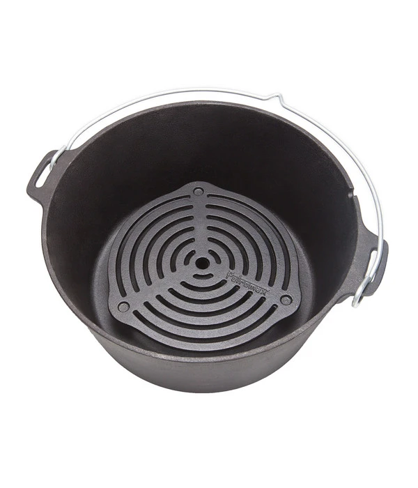 Der Feuertopf-Stapelrost von Petromax wurde aus hochwertigem Gusseisen gefertigt und ist dank der vorbehandelten Oberfläche sofort für den Einsatz bereit. Da der Rost auf der Oberseite clevere Vertiefungen hat, lassen sich mehrere Modelle perfekt übereinanderstapeln: So wird das Schmoren und Dampfgaren auf mehreren Ebenen möglich. Seine drei Standfüße bieten im Feuertopf genauso wie in der Grillglut sicheren Halt und machen ihn auch als hitzebeständigen Untersatz verwendbar.