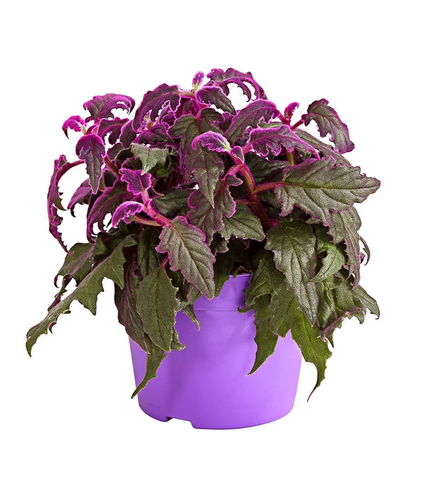 Wenn Sie Indonesien oder speziell die Inseln Java und Sulawesi schon bereist haben, konnten Sie die Gynure vielleicht schon in freier Natur bewundern. Sie wächst dort als Halbstrauch mit überhängenden Trieben und zählt zur Familie der Korbblütler, ist somit weitschichtig mit den Chrysanthemen verwandt. Ins Auge fällt die Samtpflanze wegen ihrer besonders exotischen Optik: sie hat große, gezähnte Blätter, die überzogen sind mit einem feinen Flaum in leuchtendem Violett. Im späten Herbst oder im Frühjahr kann die Zimmerpflanze orangefarbene Blüten bekommen. Das ist ein weiterer extravaganter Blickfang, denn durch die violette Blattrandung sticht das helle Orange besonders heraus. Doch der Duft den die Blüten verbreiten ist nicht jedermanns Geschmack, notfalls sollten Sie diese noch vor dem Öffnen abknipsen.