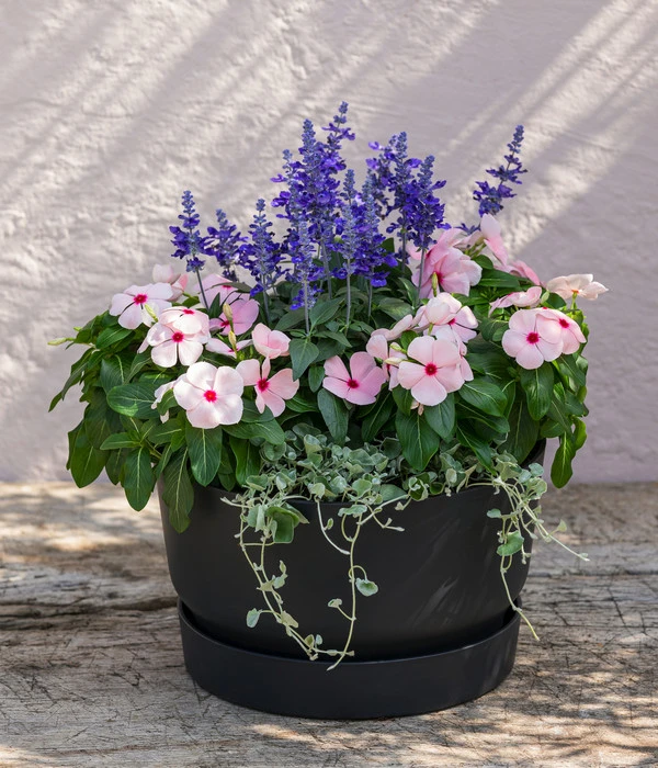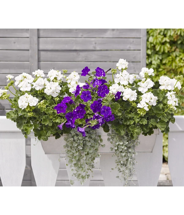 Besonders schön kommt der silbergrüne ‚Wasserfall‘ in Kombination mit bunt blühenden Balkonpflanzen zur Geltung, wobei die Wahl der Farbe über den Effekt entscheidet. Romantisch verspielt wirken gemischte Pflanzungen mit dem rosafarbenen Gefüllten Fleißigen Lieschen, weißen Schneeflöckchen und Weichem Honiggras. Modern wirken Kombinationen mit Sommerblumen in der Powerfarbe Lila, wie mit dem Kapkörbchen, Verbenen und der Vanilleblume, die zugleich noch verführerischen Duft spendet. Oder sind Sie ein Fan feuriger Blütenfarben, haben aber einen eher schattigen Balkon? Dann wählen Sie als Partner zum Silberregen rote Knollenbegonien und stehende Fuchsien.