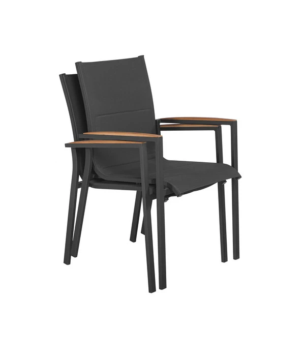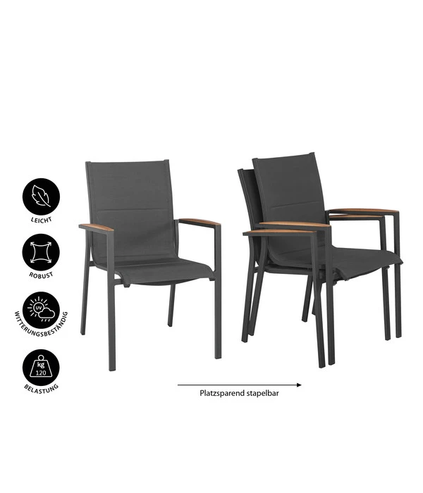 Die Anforderungen an moderne Gartenmöbel sind hoch und zahlreich. Denn sie sollen superpraktisch sein, man möchte bequem in ihnen sitzen und gut ausschauen sollen sie dabei auch noch. Das ist viel. Nicht aber für den Tierra Outdoor Stapelstuhl Foxx, der auf jeder Dimension mit Höchstleistungen punktet. Fangen wir mit dem Design an, das schlicht und modern ist, so wie man heute gerne hat. Der zeitgemäße Look wird auch durch die Materialwahl unterstützt, denn das Gestell des Gartenstuhls besteht aus Aluminium, die Bespannung auf dem Sitz und am Rücken aus dem inzwischen bewährten Funktionsgewebe Textilen. Gestell und Bespannung präsentieren sich in einem edlen Anthrazitgrau, zu dem die Armlehnen einen warmen Kontrastpunkt setzen, denn sie sind mit einer Auflage aus Teakholz versehen. Das Holz verleiht dem Stuhl die elegante Note und erhöht zugleich den Komfort, denn Holz fühlt sich nie unangenehm heiß oder kalt an. Erleben Sie bald wunderschöne Sommertage – in dem Tierra Outdoor Stapelstuhl Foxx!